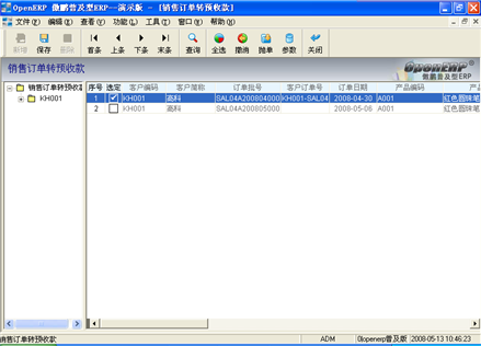 選 定:同時滿足條件的銷售訂單資料有多條,可選定其中某條或某些記錄轉成預收款,若要全部選定,可以點擊菜單項“功能/全選”或點擊相應圖標,將所有項目全選,也可以點擊菜單項“功能/撤銷”或點擊相應圖標,將選中項目撤銷