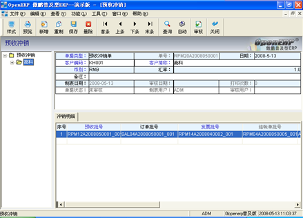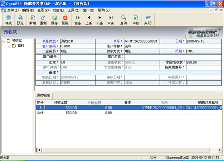 登錄系統后,在左邊的模塊區中,找到“應收管理/預收帳款管理/預收款”后雙擊它,進入“預收款”窗口(見圖12),此文件柜可以新建預收款單據,也可對由銷售訂單生成預收款單據進行查看、修改,然后將單據審核