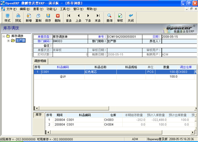 登錄系統(tǒng)后,在左邊的模塊區(qū)中,找到“庫(kù)存管理/庫(kù)存調(diào)撥/庫(kù)存調(diào)撥”,進(jìn)入“庫(kù)存調(diào)撥”窗口(見(jiàn)圖36),此文件柜可以新建庫(kù)存調(diào)撥單據(jù),將物料從一個(gè)倉(cāng)庫(kù)調(diào)撥到另外一個(gè)倉(cāng)庫(kù)