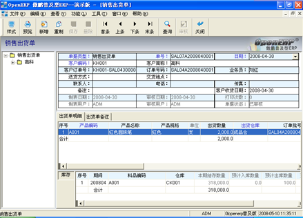 登錄系統后,在左邊的模塊區中,找到“銷售管理/銷售出退貨/銷售出貨單”后雙擊它,進入“銷售出貨單”窗口(見圖6)。此文件柜可建立新的出貨單,也可對由銷售訂單生成的出貨單進行查看、修改,然后審核單據